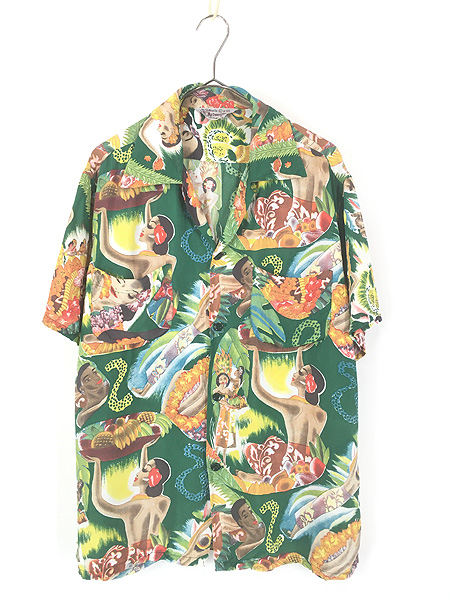 古着 40s Artvogue in California マッキントッシュ メニュー柄 開襟 レーヨン アロハ ハワイアン シャツ L