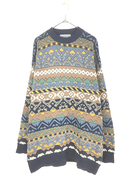 古着 90s TIME SPORTS カラフル 幾何学 ネイティブ ボーダー ウール ニット セーター XXL位