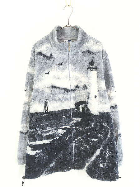 古着 90s USA製 ART UNLIMITED 灯台 風景 総柄 フリース ジャケット L