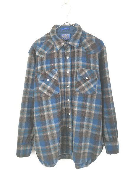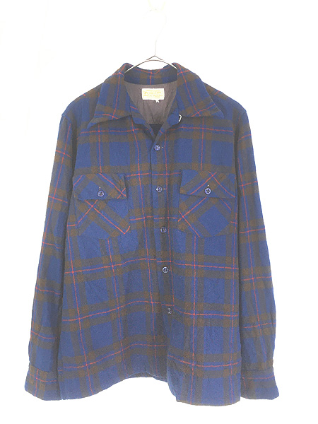 古着 40s Pendleton 好配色 ブルー×ブラウン×レッド チェック 開襟 ボックス ウール ボード シャツ XL位