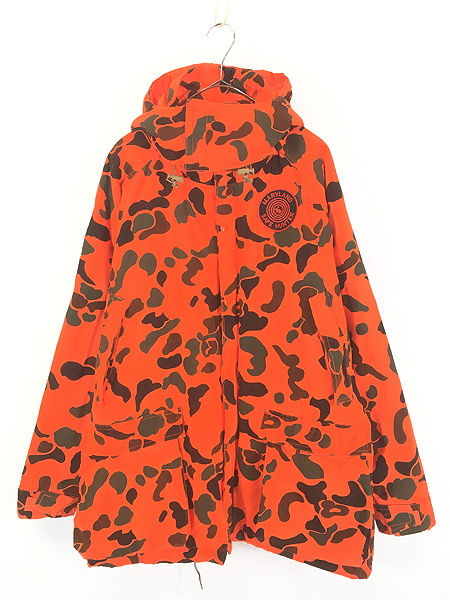 古着 90s WoolRich 蛍光 ダックハンター カモ 迷彩 パデッド ハンティング ジャケット パーカー ブレイズオレンジ M