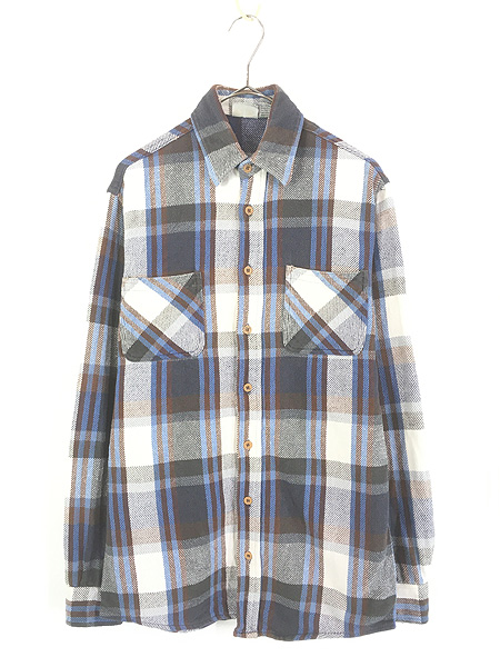 古着 70s USA製 FIVE BROTHER ネイビー×ブルー×ホワイト ブロック チェック ヘビー フランネル シャツ ヘビネル M