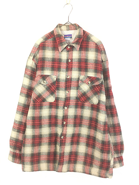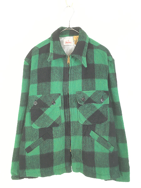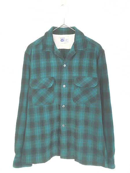 古着 60s Sears PILGRIM 好配色 グリーン × ブラック バッファロー チェック 開襟 ボックス ウール シャツ M