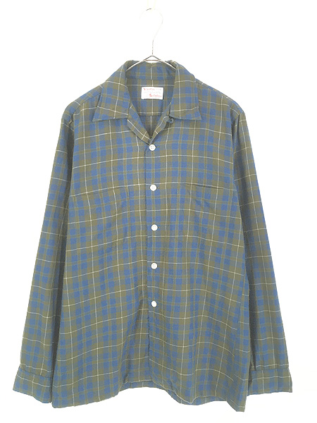 古着 60s Great Britain製 Viyella Manhattan 好配色 オリーブ チェック 開襟 ボックス ウール シャツ S