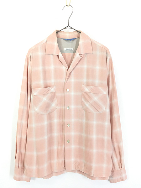 古着 50s Sportsman by Cal-made 貴重!! ピンク オンブレ シャドー チェック 開襟 ボックス レーヨン ギャバジン シャツ M