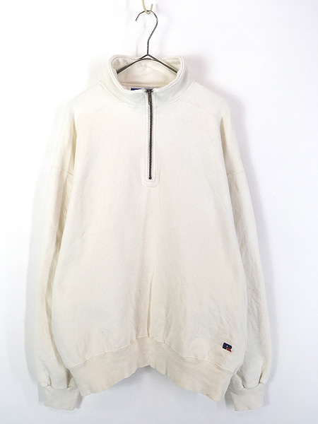 古着 90s USA製 Russell High Cotton 無地 プレーン クォーター ジップ ヘビー スウェット トレーナー ポケット付 ホワイト XL