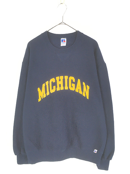 古着 90s USA製 Russell 「MICHIGAN」 前V セットイン スウェット トレーナー ネイビー L
