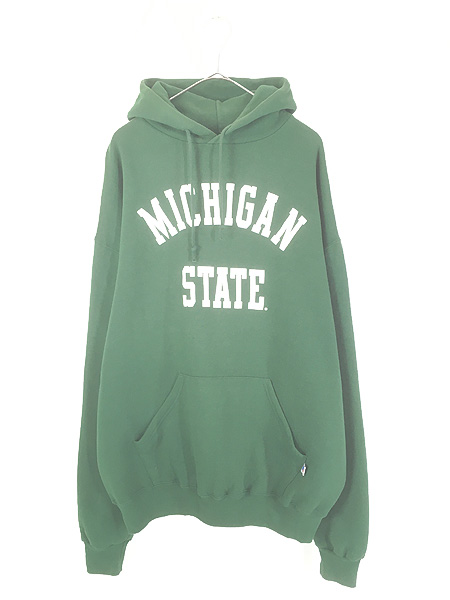 古着 90s Russell 「MICHIGAN STATE」 アーチ セットイン スウェット パーカー グリーン×ホワイト XL ミント!!