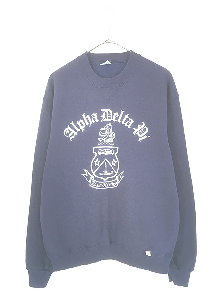 古着 80s USA製 Russell 「Alpha Delta Pi」 前V セットイン スウェット トレーナー ネイビー M