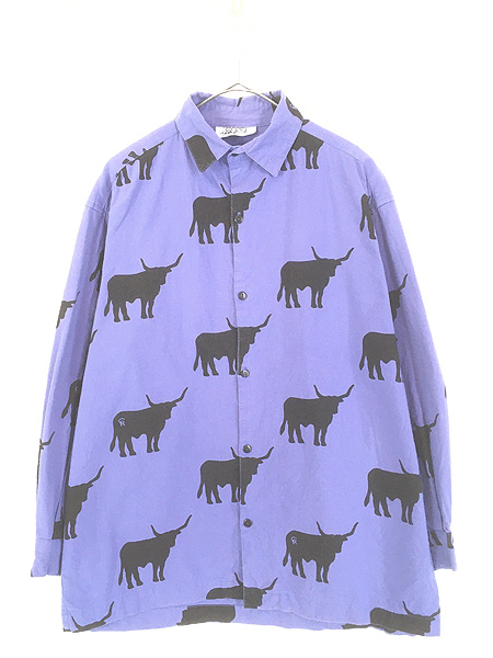 古着 90s USA製 牛 ウシ バッファロー アニマル シルエット 総柄 シャツ S