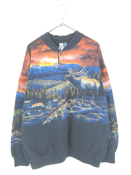 古着 90s USA製 Art Unlimited シカ アニマル 総柄 ポケット付 スウェット トレーナー XL位