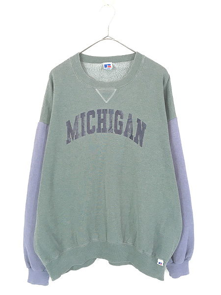 古着 90s Russell 「MICHIGAN」 前V グリーン×ラベンダー 2カラー スウェット トレーナー XL位