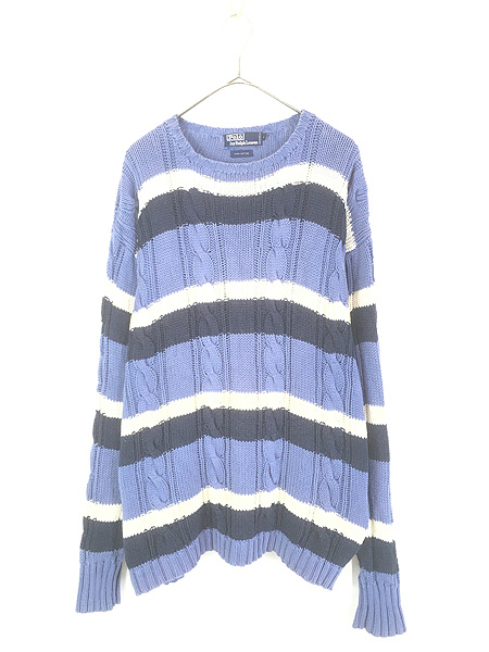 古着 90s Polo Ralph Lauren マルチ ボーダー × ケーブル編み コットン ニット セーター L