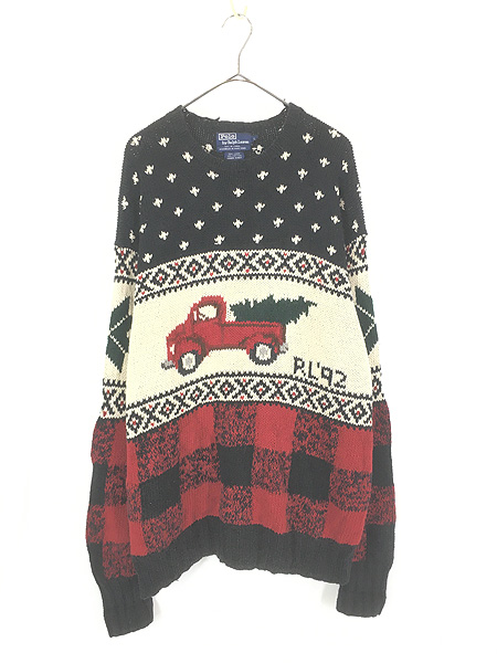 古着 90s Polo Ralph Lauren モミの木×車 ノルディック コットン リネン ハンドニット セーター L