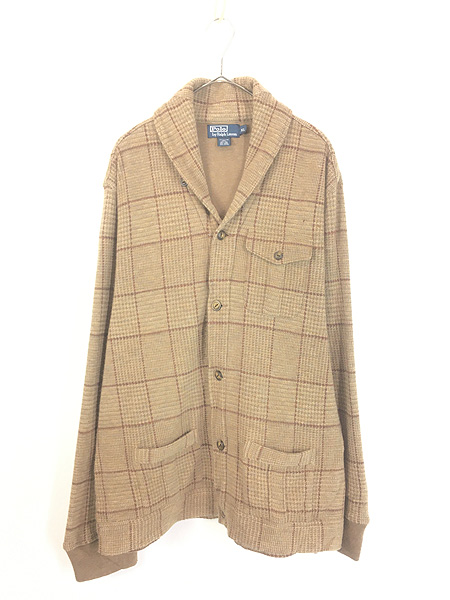 古着 Polo Ralph Lauren ブラウン チェック ショールカラー ハイゲージ ウール ニット ジャケット XL