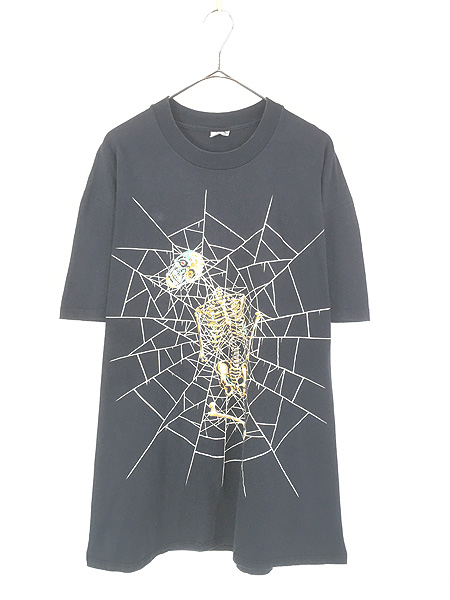古着 90s USA製 Wild Oats 蜘蛛の巣 スパイダー ウェブ スカル ボーン Tシャツ XL