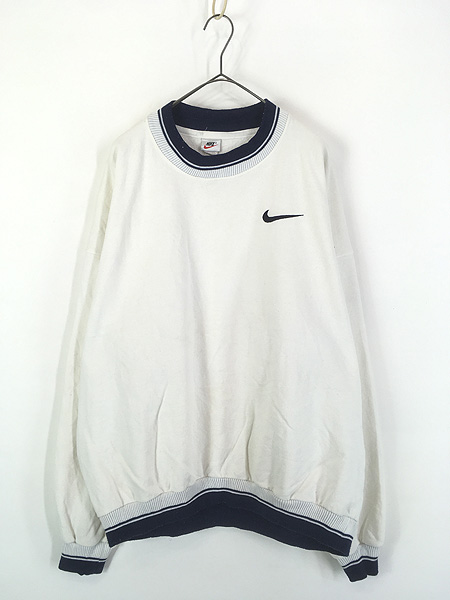 古着 90s USA製 NIKE スウォッシュ ワンポイント 刺しゅう リブライン スウェット トレーナー ホワイト XXL