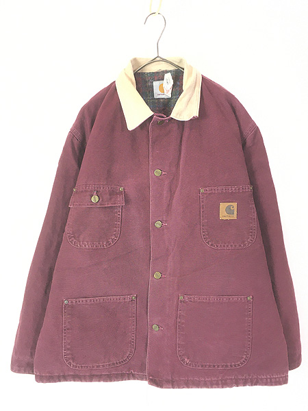 古着 90s USA製 Carhartt 裏地 チェック ブランケット ワインレッド ダック ミシガンチョア カバーオール ジャケット L
