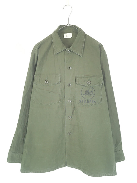 古着 70s 米軍 US NAVY SEABEES 100% コットンサテン ミリタリー ファティーグ シャツ 16 1/2