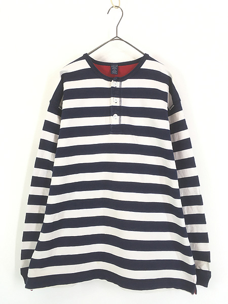 古着 90s LANDS' END ネイビー × ホワイト 太ピッチ マリン ボーダー 5ボタン プルオーバー ヘビー コットン カットソー XL