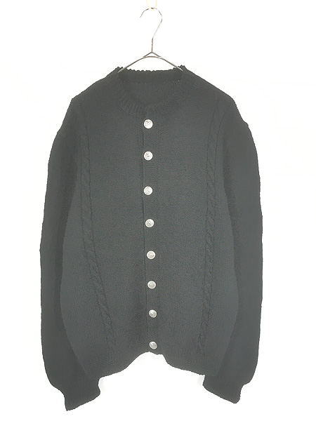 古着 50s メタルボタン ケーブル & 畔編み ローゲージ ヘビー ウール ニット ハイネック カーディガン ブラック XL位