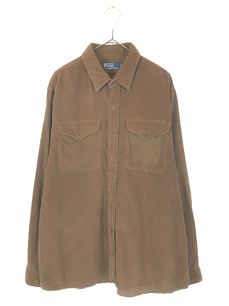 古着 Polo Ralph Lauren 「Polo Country」 本革 レザー エルボーパッチ ポケット付 細畝 コーデュロイ シャツ ブラウン XL