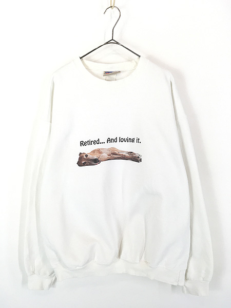 古着 90s 犬 ドッグ フォト 「Retired...And loving it.」 メッセージ アニマル スウェット トレーナー L