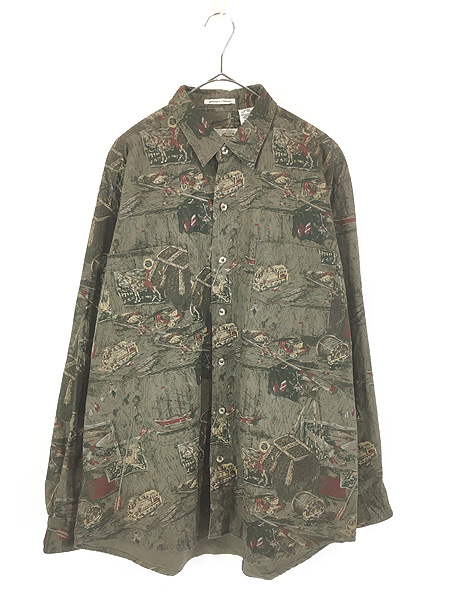 古着 90s Eddie Bauer 名品 「Elkhorn Twill」 釣り具 汽車 船 総柄 コットン ツイル シャツ L