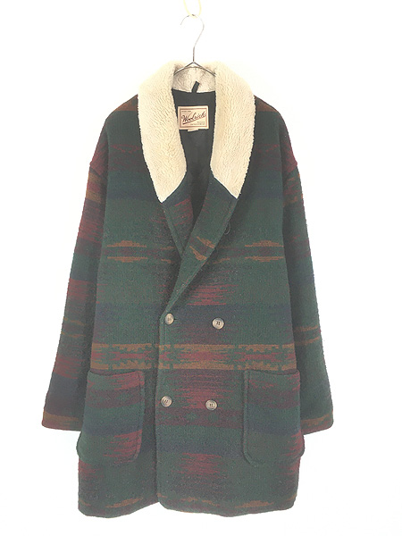 古着 90s USA製 WoolRich ネイティブ ボーダー 総柄 ショールカラー ダブルブレスト ウール ブランケット コート L