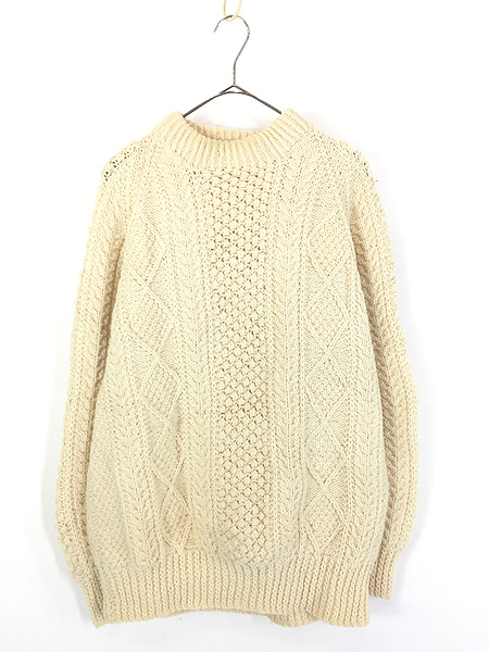 古着 70s Ireland製 connemara handcrafts ポップコーン アラン フィッシャーマン ローゲージ ウール ハンド ニット セーター XL位