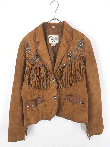 レディース 古着 90s CRIPPLE CREEK 本革 スエード レザー コンチョ スタッズ フリンジ ウエスタン ジャケット L