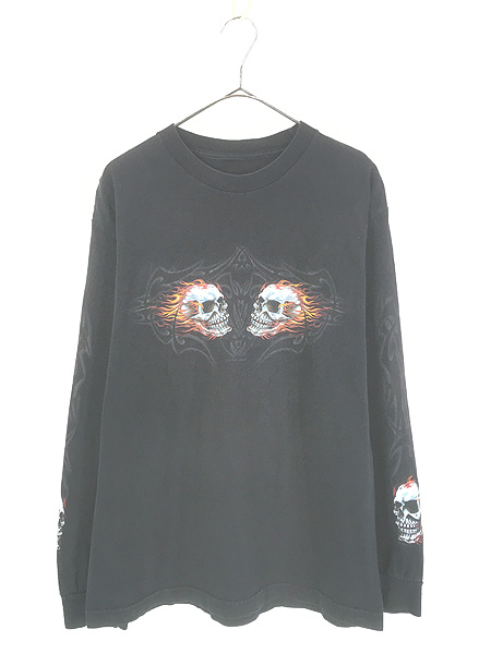 古着 00s Good Sports ファイヤー スカル トライバル 長袖 Tシャツ ロンT M位