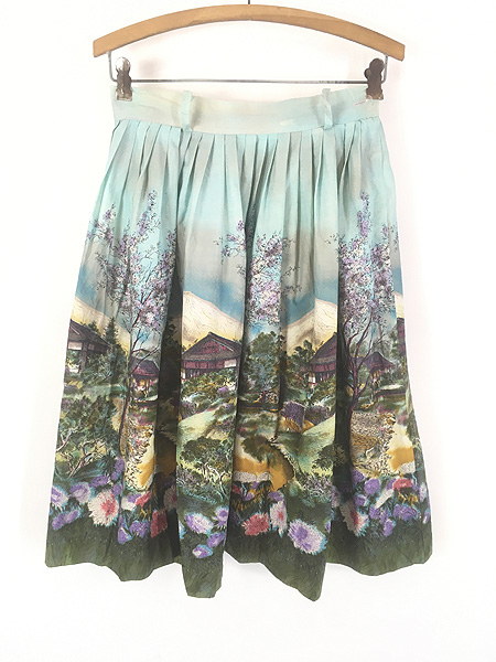 レディース 古着 50s 古民家 山 花 和柄 アート 総柄 コットン フレア スカート ひざ丈 M位