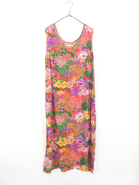 レディース 古着 90s USA製 JAMS WORLD カラフル 花 フラワー アート 総柄 レーヨン ノースリーブ ワンピース ロング丈 XL