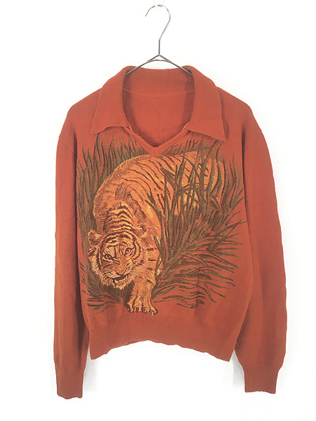 レディース 古着 70s 虎 タイガー アニマル 襟付き ライト ニット セーター L位