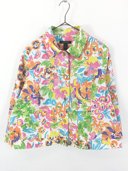 レディース 古着 LAUREN RalphLauren カラフル フラワー ペイント アート ホワイト デニム トラッカー ジャケット XL