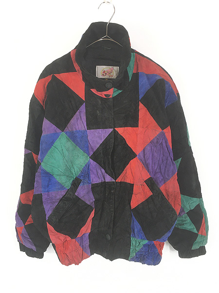 レディース 古着 90s ADLER トライアングル ダイヤ カラフル 本革 レザー パッチワーク ジャケット M