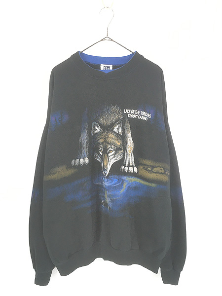 古着 90s USA製 Art Unlimited オオカミ ウルフ 水面 Wネック ポケット付 スウェット トレーナー XXL