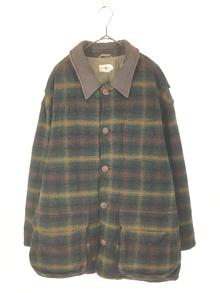 古着 90s Singapore製 J Crew 襟レザー 好配色 チェック パデッド ウール カバーオール ジャケット XL