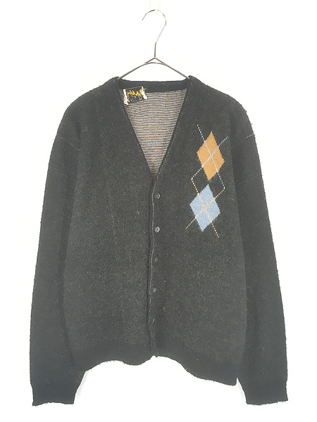 古着 60s USA製 Ashley ダイヤ パターン シャギー アクリル ニット カーディガン ブラック XL位