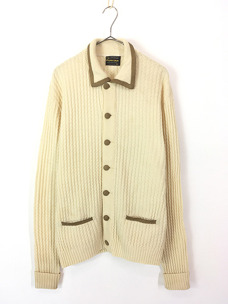 古着 60s USA製 PURITAN スエード レザー パイピング 襟付 ロカビリー ウール ニット カーディガン M