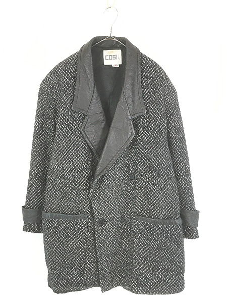 古着 90s USA製 COSI 本革 レザー × ごま塩 ソルト&ペッパー デザイン ダブルブレスト ビッグシルエット ウール コート L