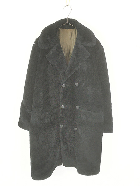 古着 80s シャギー ブラック フェイクファー ダブルブレスト コート XL位