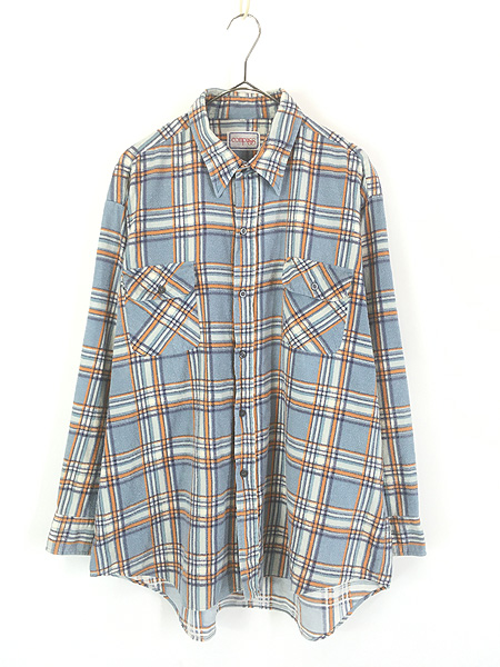 古着 80s Compass ブルー チェック プリント ライト フランネル コットン シャツ ネルシャツ XL