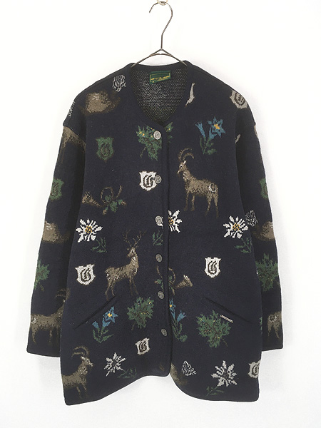 レディース 古着 80s Austria製 GEIGER 花 フラワー 鹿 ヤギ ノーカラー ニット カーディガン 40 L位