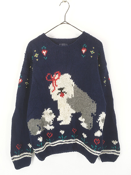 レディース 古着 80s WoolRich 犬 シープドッグ アニマル リボン ハンド ニット セーター M