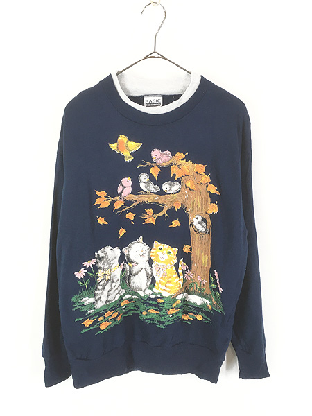 レディース 古着 90s USA製 鳥 猫 落ち葉 重ね着風 スウェット トレーナー S