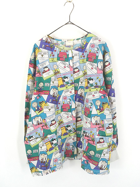 レディース 古着 90s USA製 PEANUTS スヌーピーと仲間たち キャラクター 総柄 ノーカラー ホスピタル シャツ ジャケット L