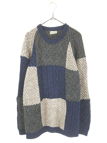 古着 80s Ireland製 Carraig Donn クレイジー パッチワーク ローゲージ ウール ハンド ニット セーター L