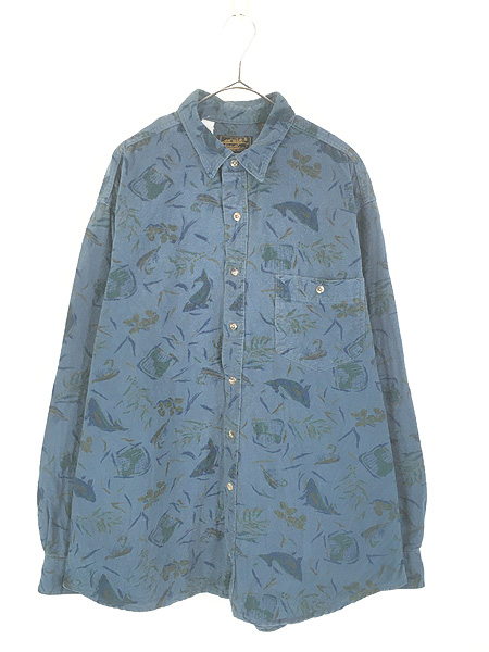 古着 80s USA製 Eddie Bauer おさかな 釣り アウトドア 総柄 フランネル シャツ ネルシャツ XL